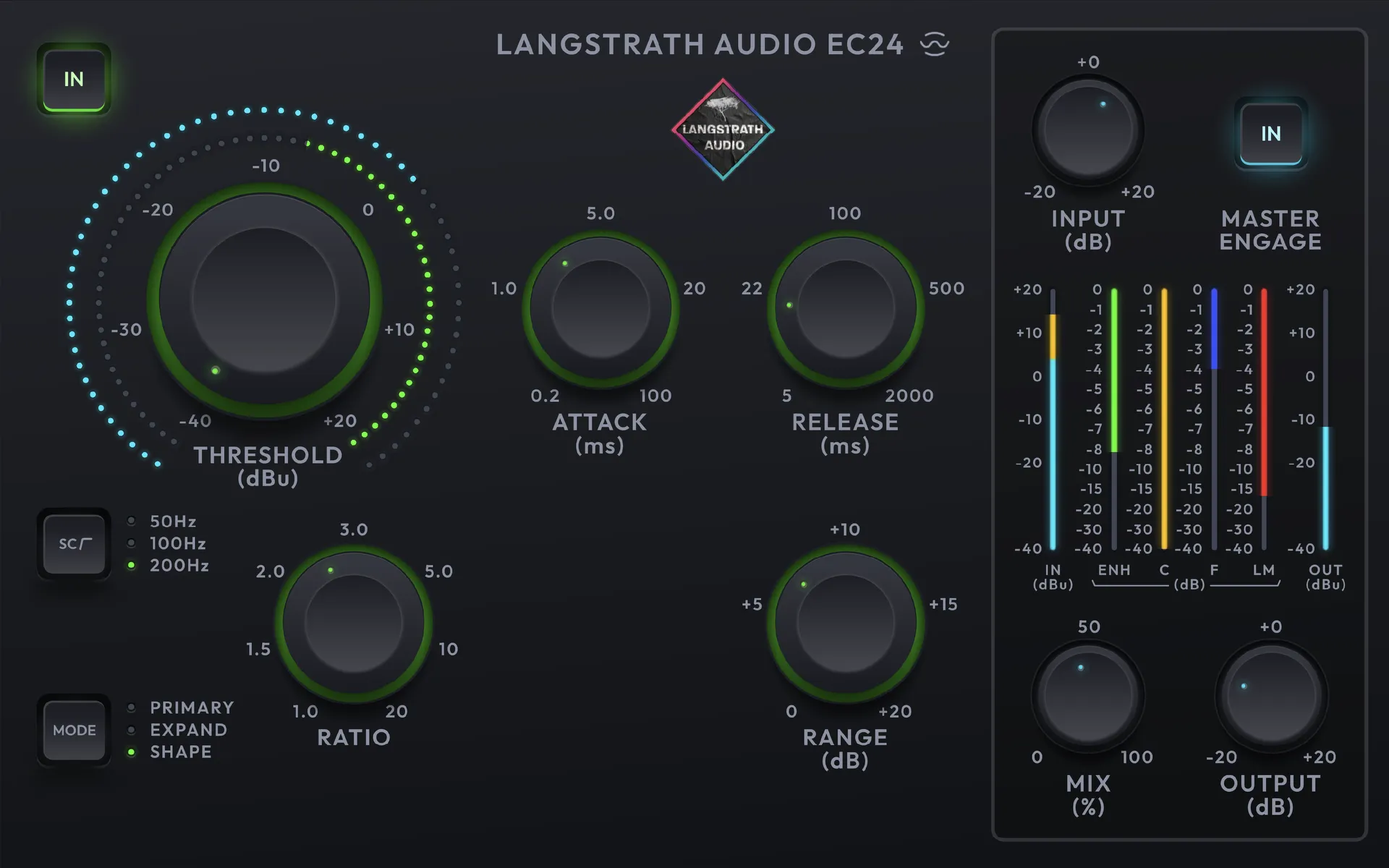 Der Enhancer stellt die erste Stufe der Dynamikkette des EC24 dar und verfügt über zwei Betriebsmodi: Der Primary Mode ist zur Klangverbesserung von Gesang und anderen nicht perkussiven Signalen vorgesehen. Er reduziert Bühnenrauschen und Übersprechen im Gesang, erhöht den nutzbaren Pegel vor Rückkopplungen und sorgt insgesamt für einen saubereren Mix. Im EXP/Gate-Modus stehen erweiterte Parameter für einfaches Gating und Transientenformung zur Verfügung.