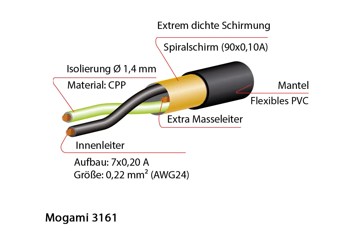 Das 3161 Multicore von MOGAMI ist für die Übertragung digitaler Audio-Signale nach dem AES/EBU-Standard optimiert. Die geforderte Impedanz von 110 Ohm wird mit einer Toleranz von nur ±10% garantiert. Ein geringer kapazitiver Widerstand und ausgesuchte Materialien gewährleisten neben den hervorragenden Übertragungs-Eigenschaften auch die unkomplizierte Handhabung des Kabels.