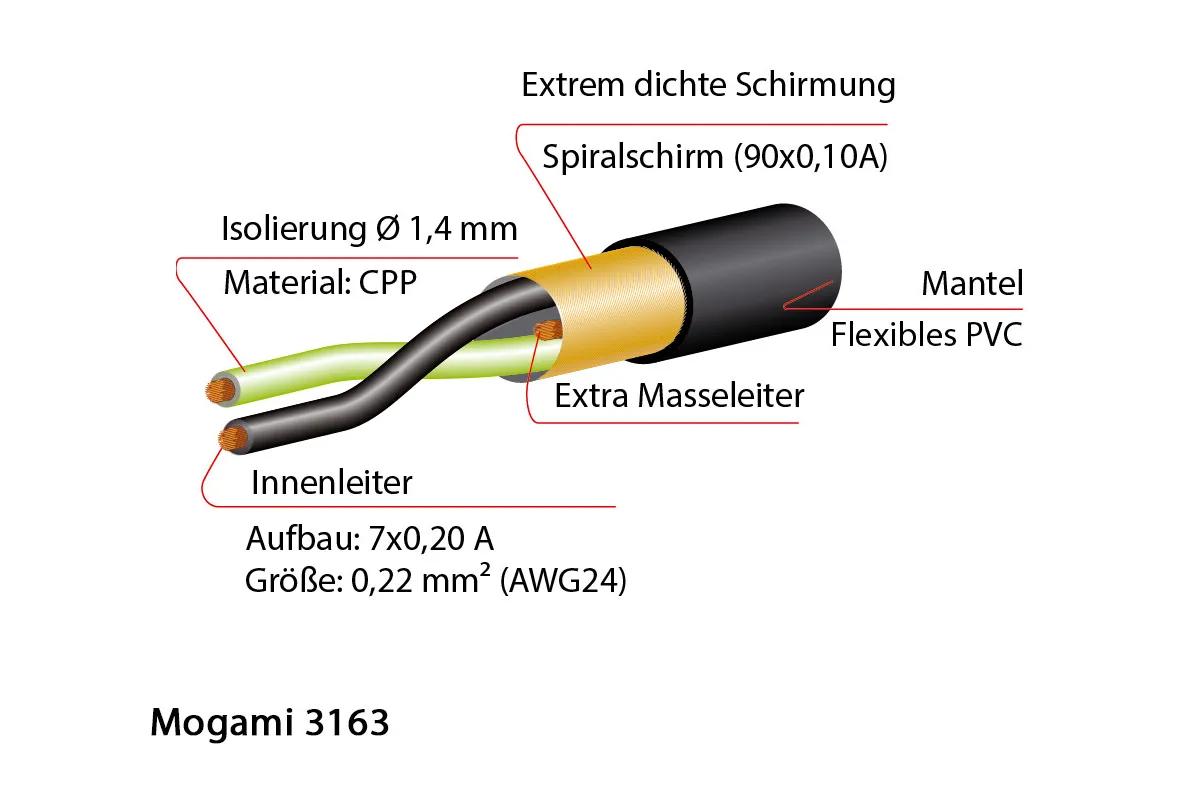 Das 3163 Multicore von MOGAMI ist für die Übertragung digitaler Audio-Signale nach dem AES/EBU-Standard optimiert. Die geforderte Impedanz von 110 Ohm wird mit einer Toleranz von nur ±10% garantiert. Ein geringer kapazitiver Widerstand und ausgesuchte Materialien gewährleisten neben den hervorragenden Übertragungs-Eigenschaften auch die unkomplizierte Handhabung des Kabels.